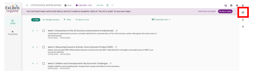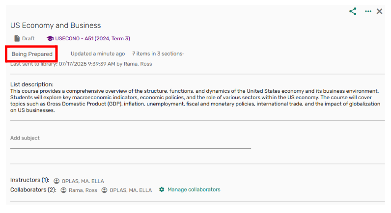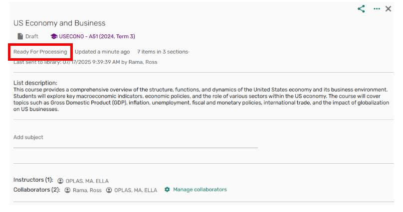 When you are finished with your READING LIST, you will need to send it to the library for REVIEW. Sending the READING LIST to the library allows them to see and work on your list, such as putting items on COURSE RESERVE or PURCHASING REQUESTED RESOURCES.