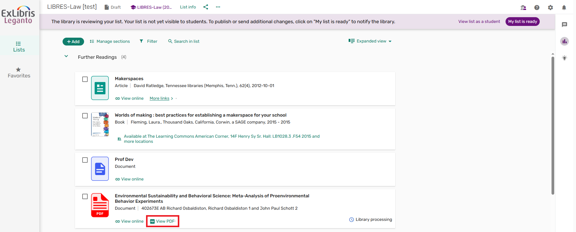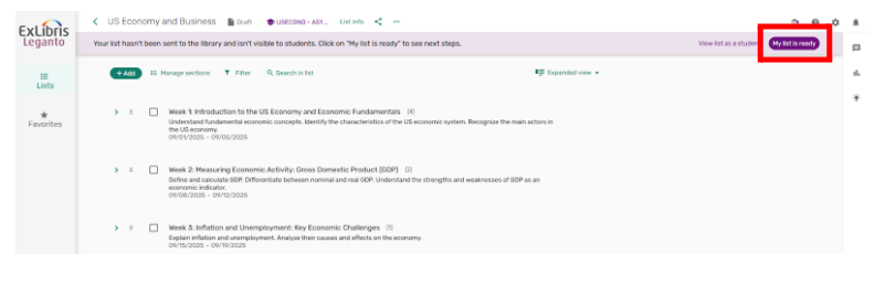 To send the READING LIST to the library for REVIEW, click the MY LIST IS READY button.